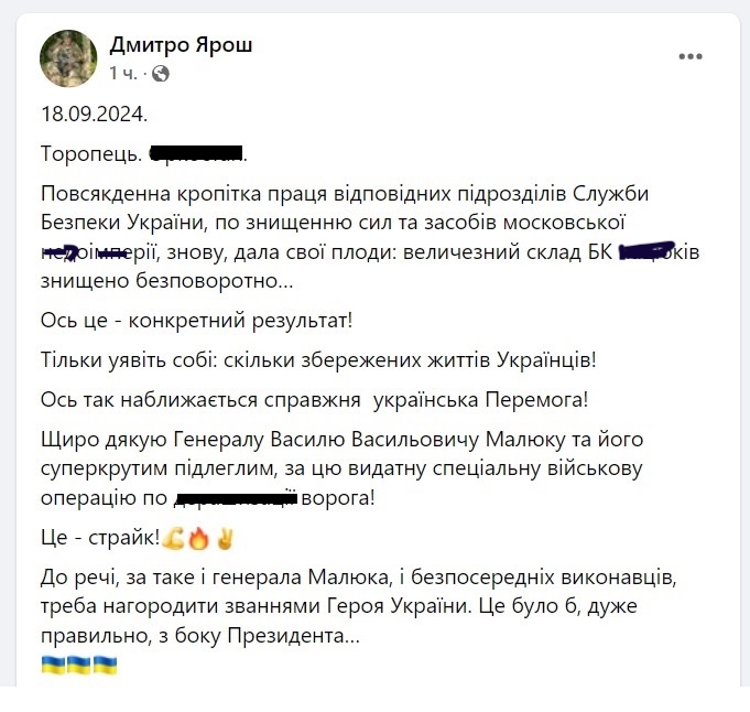 “Повсякденна клопітка робота відповідних підрозділів Служби безпеки України зі знищення сил та засобів московської імперії знову дала свої плоди: величезний склад боєприпасів росіян знищено безповоротно… Оце конкретний результат! Тільки уявіть собі, скільки збережених життів українців! Отак наближається справжня українська Перемога!” – зазначив Ярош.