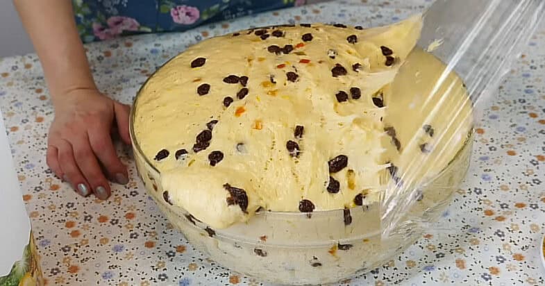 Родзинки заливаю гарячою водою, щоб вони стали м’якшими, а також готую цукати і натираю цедру одного лимона на дрібній тертці, використовую лише жовту частину, щоб не було гіркоти. Через годину тісто добре підходить, стає пухким і повітряним. Я злегка змащую руки олією, обминаю тісто і висипаю на стіл ще приблизно 100 г борошна. Легко вимішую тісто, розтягую його руками, додаю цедру лимона і цукати, перемішую. У миску, де тісто буде підходити вдруге, наливаю трохи олії, перекладаю тісто і додаю родзинки. Знову накриваю миску плівкою і залишаю ще приблизно на 1–1,5 години, щоб тісто піднялося майже до країв.