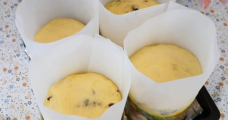 Для випікання я використовую паперові форми, у мене їх 4 штуки. Щоб паски вийшли вищими, я вставляю всередину додаткові смужки пергаменту. Коли тісто підходить, змащую руки олією, ділю його на 4 частини і обережно викладаю у форми приблизно до половини. Накриваю рушником і залишаю ще приблизно на 40–60 хвилин, поки духовка розігрівається.
