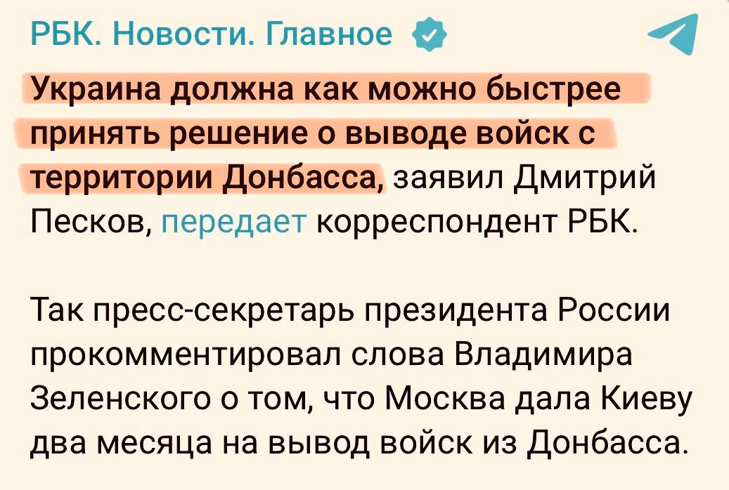 Пєсков сказав, нібито питання вже не в терміні “два місяці”, а в тому, що Україна має негайно вивести війська за адміністративні кордони так званої ДНР. За його словами, це нібито дозволило б зупинити бойові дії.