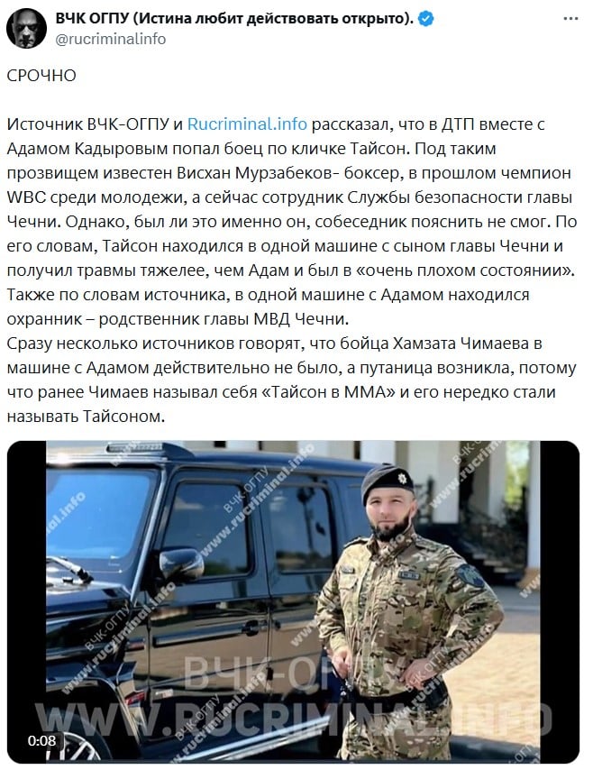 У повідомленні йдеться, що згаданий боксер знаходився в одній машині з Адамом Кадировим і отримав серйозніші трави, ніж син голови Чечні.
