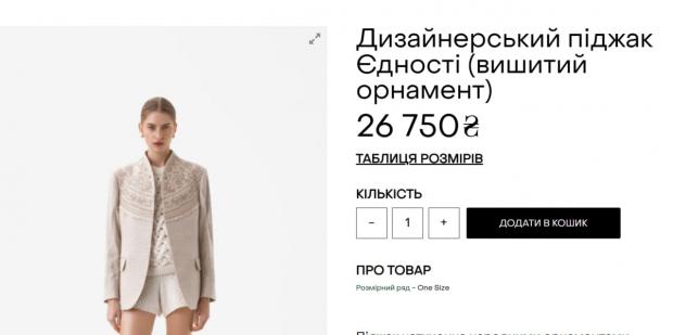 Дизайнерський піджак Єдності з вишивкою від українського бренда Gaptuvalnya коштує на сайті виробника майже 27 тис. грн.
