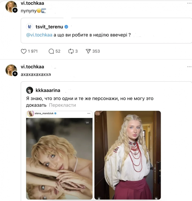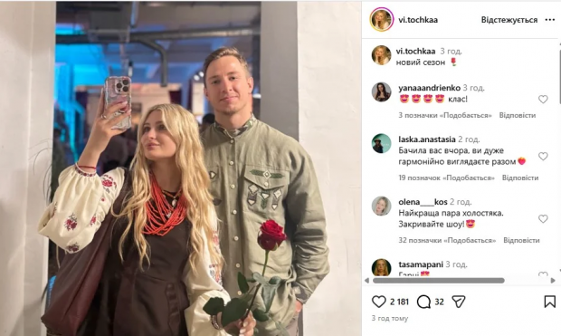 Зварич і Терен узгодили свої образи, обравши одяг в українському стилі. «Бачила вас учора, ви дуже гармонійно виглядаєте разом», — написали у коментарях під фото. «Клас», — зазначила учасниця шоу Холостяк 14 Яна Андрієнко.