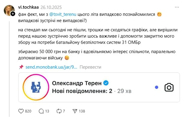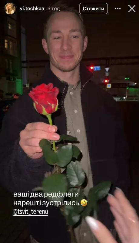 На сторінці в Instagram Зварич повідомила, що зустрілася з Тереном, і показала їхнє спільне фото. Терен подарував Віточці троянду. «Новий сезон», — підписала фото з Олександром Вікторія. Вони відвідали захід Андріївські вечорниці від культурно-соціального проєкту OKAZIYA у КультМотив. «Ваші два редфлеги нарешті зустрілися», — прокоментувала у Stories Зварич. «Навіть у пітьмі видно хороших людей», — сказав Терен і вручив троянду.
