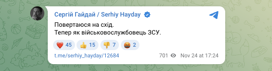 Колишній голова Луганської ОВА Сергій Гайдай заявив, що став військовослужбовцем ЗСУ. Він є фігурантом справи про корупцію на закупівлі безпілотників і РЕБ. Про це повідомляють Патріоти України з посиланням на заяву ексчиновника.