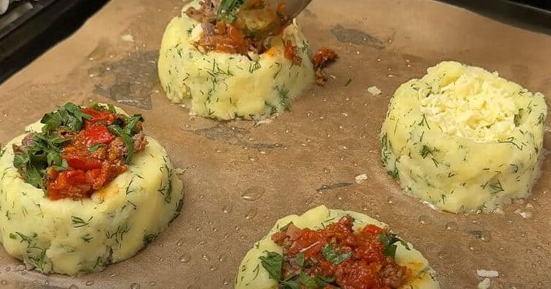 Беру деко від духовки, кладу пергамент, змащую олією. З картоплі формую кульки і роблю склянкою заглиблення. Кладу всередину тертий сир, начинку і ще тертий сир зверху.