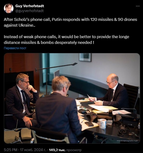 “Після телефонного дзвінка Шольця Путін відповідає 120 ракетами та 90 безпілотниками проти України. Замість слабких телефонних дзвінків було б краще надати далекобійні ракетu та б0мби, яких ми відчайдушно потребуємо!” – пише колишній прем’єр-міністр Бельгії Гі Верхофстадт на своїй мандрівниці у соцмережі X.