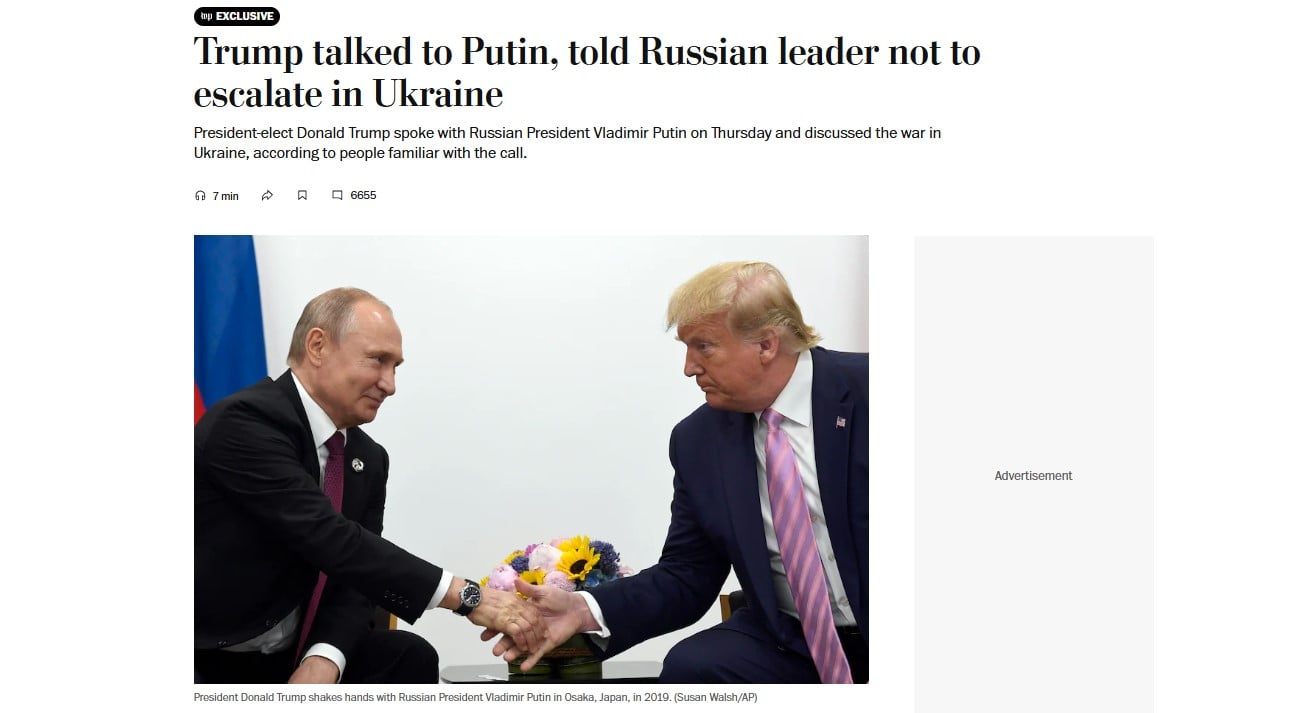 Минулого тижня авторитетна американська газета The Washington Post написала, що після перемоги Трампа на виборах у нього відбулася телефонна розмова з Путіним, під час якої майбутній господар Білого дому попросив російського правителя не йти на ескалацію в Україні, а також повідомив про свої наміри продовжити контакти із Москвою для досягнення миру в Україні. І якщо в Кремлі спростовували бесіду Трампа і Путіна, то у обраного президента США тактовно промовчали, не підтверджуючи, але й не спростовуючи розмову, що відбулася, а це натякає на те, що озвучена американськими журналістами інформація правдива і дзвінок дійсно мав місце бути.