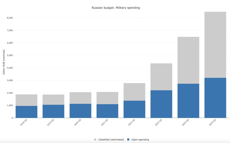 Силовий блок в цілому отримує близько 40% бюджету РФ, що відповідає 8% ВВП. Джерела Reuters кажуть, що навіть якщо мирні переговори щодо України відбудуться, Кремль не збирається скорочувати витрати у 2026 році.