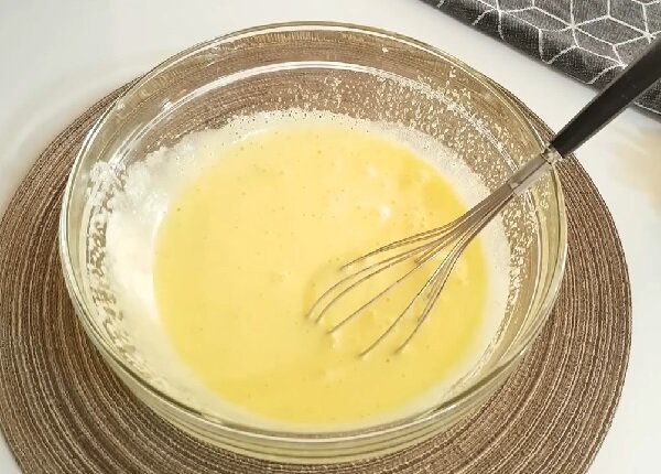 Приготуємо тісто. У велику миску розбийте 3 яйця, додайте|добавляйте| цукор, добре перемішайте в білу піну.