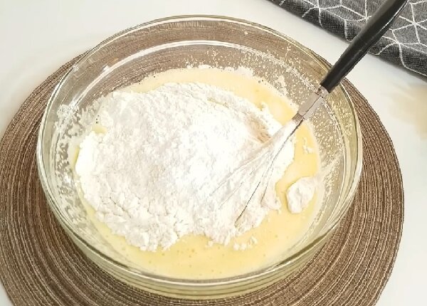 В отриману суміш додайте борошно, що просіює, 2/3 чайної ложки розпушувача, пакетик ванільного цукру і щіпку солі.