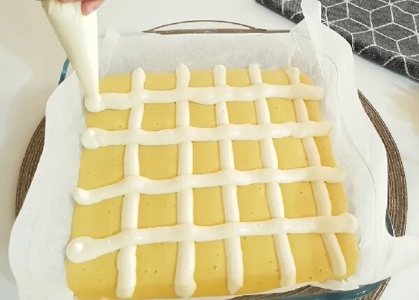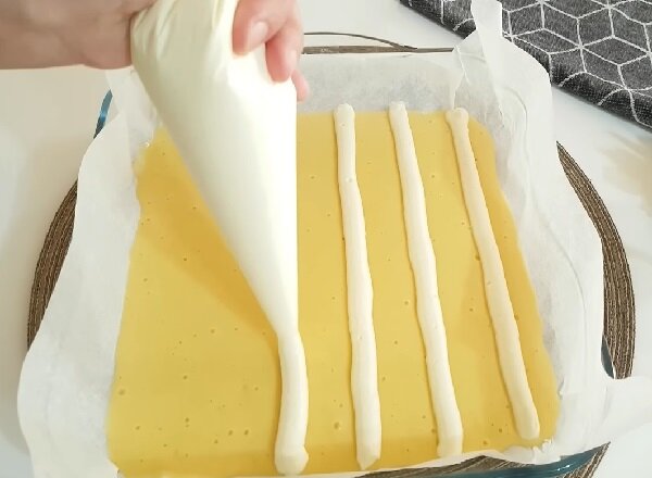 Обережно видавлюючи сирну начинку з кондитерського мішка, намалюйте поверхні тесту у вигляді «сіточку», розміщуючи смужки крему з відривом 3 – 4 див друг від друга.