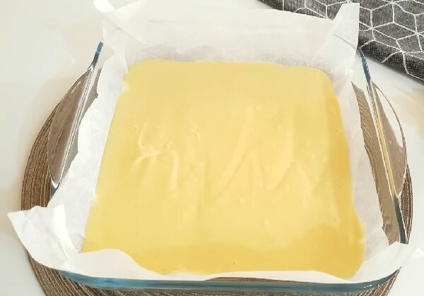 Візьміть форму для запікання розміром 22х22 см, застеліть її шматком пергаментного паперу. Зверху вилийте тісто, розрівняйте поверхню лопаткою.