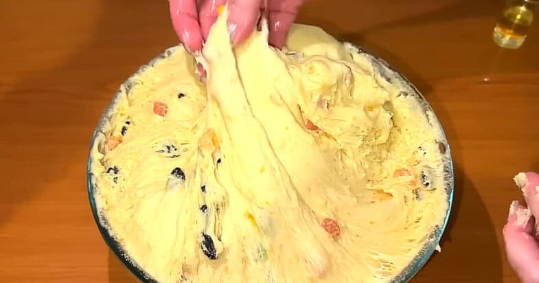 Зливаю воду із сухофруктів, добре їх обсушую і додаю у тісто, акуратно перемішуючи, щоб вони рівномірно розподілилися. Накриваю миску рушником і залишаю тісто підходити приблизно на 1–1,5 години у теплому місці.