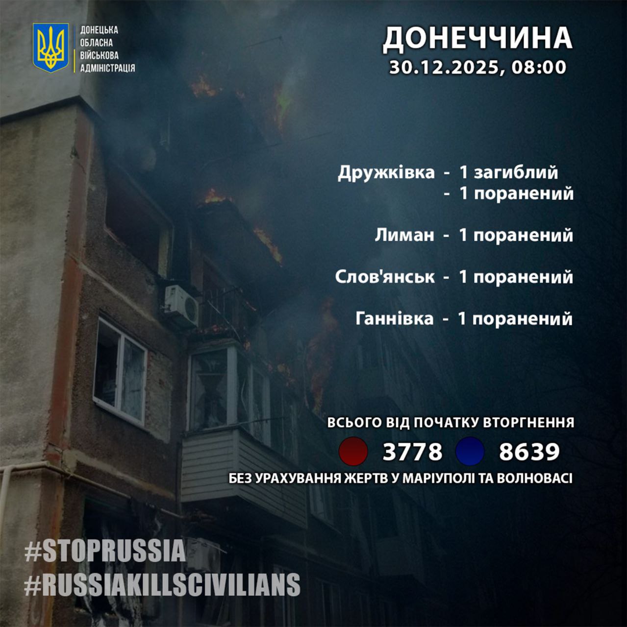 У Донецькій області, за інформацією глави ОВА Вадима Філашкіна, 29 грудня в Дружківці загинув один житель, ще четверо отримали поранення.