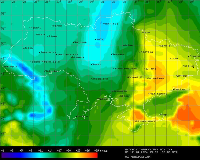 Як розповіла синоптик Наталія Діденко, денна температура на більшій частині території України становитиме +10…15 градусів. На сході, південному сході та в Криму ще збережеться тепло +19…23, але в неділю і там стане значно прохолодніше.