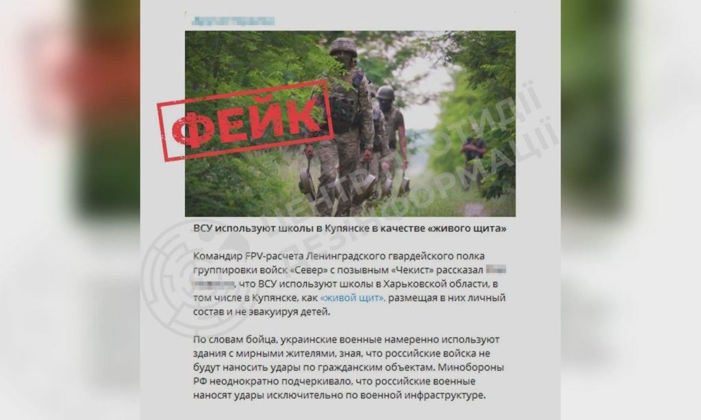 “РФ поширює повідомлення, ніби українські військові в Куп’янську знаходяться в школі, де одночасно навчаються діти, яких вони нібито використовують як “живий щит”. Абсолютно жодних підтверджень цьому російські ЗМІ не дають, а посилаються виключно на слова одного з окупантів”, – зазначили у ЦПД.