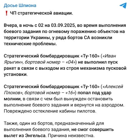 Як повідомляє телеграм-канал “Досьє шпигуна”, який, як зазначено в описі, веде співробітник однієї з російських спецслужб, ракетоносій Ту-160 з бортовим номером “16” потрапив прямо під удар блискавки, внаслідок чого був би змушений терміново повернутися на аеродром. Повідомляється про пошкодження скління кабіни пілотів.