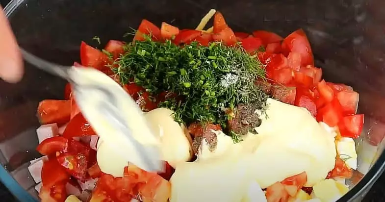Яйця та помідори нарізаю кубиками. Подрібнюю кріп. Додаю сіль, перець, майонез, перемішую.