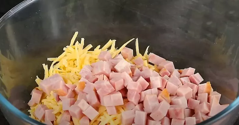 Огірки, перець та шинку нарізаю кубиками. Сир натираю на терці.