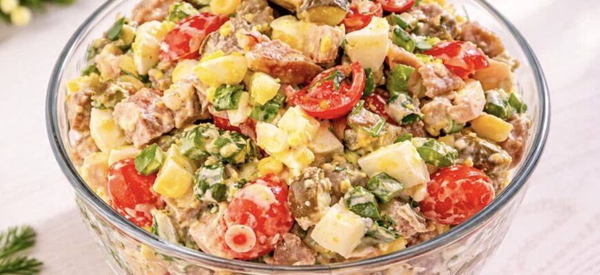 Цей салат має характер! Соковитий, м’ясний, насичений — саме такий, як люблять справжні чоловіки! Одразу два види м’яса, смак просто незабутній!