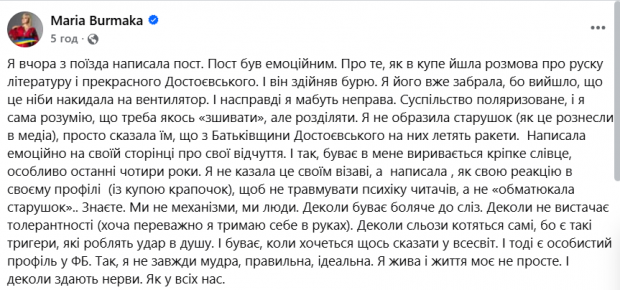 Марія Бурмака пояснила, що її пост був емоційним: «Про те, як в купе йшла розмова про руску літературу і прекрасного Достоєвського. І він здійняв бурю. Я його вже забрала, бо вийшло, що це ніби накидала на вентилятор. І насправді я мабуть неправа. Суспільство поляризоване, і я сама розумію, що треба якось «зшивати», а не розділяти».
