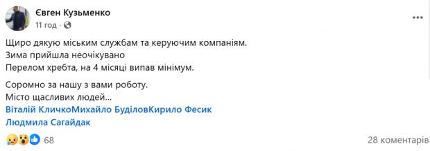 “Щиро дякую міським службам та керуючим компаніям. Зима прийшла неочікувано”, — написав депутат.