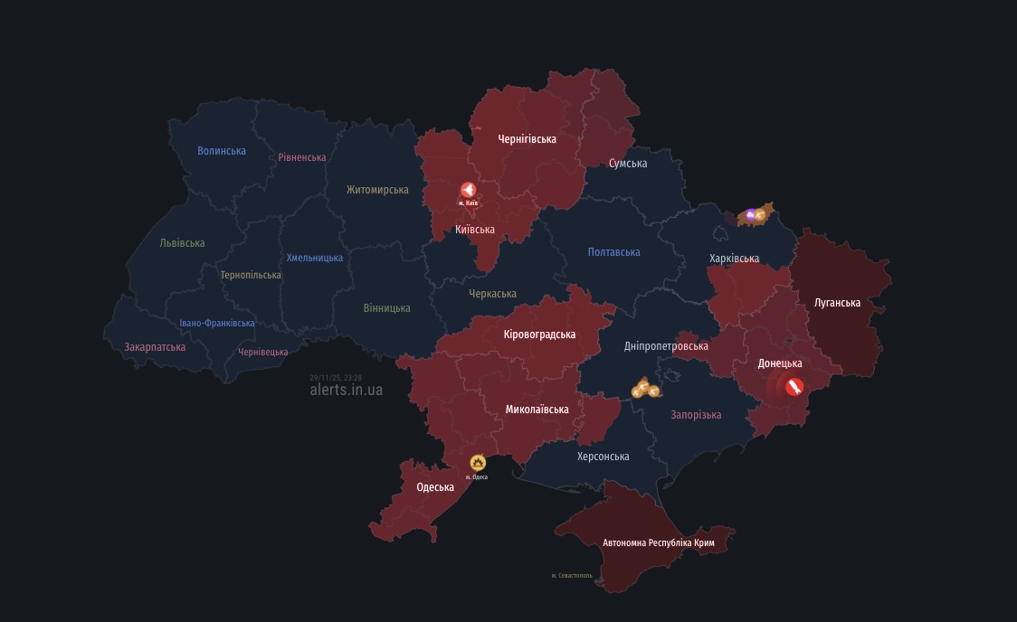 Російська армія ввечері 29 листопада знову запустила по Україні свої ударні безпілотники типу “Шахед”. Через це областями стала ширитися повітряна тривога.