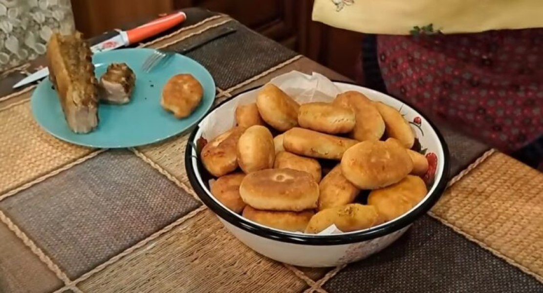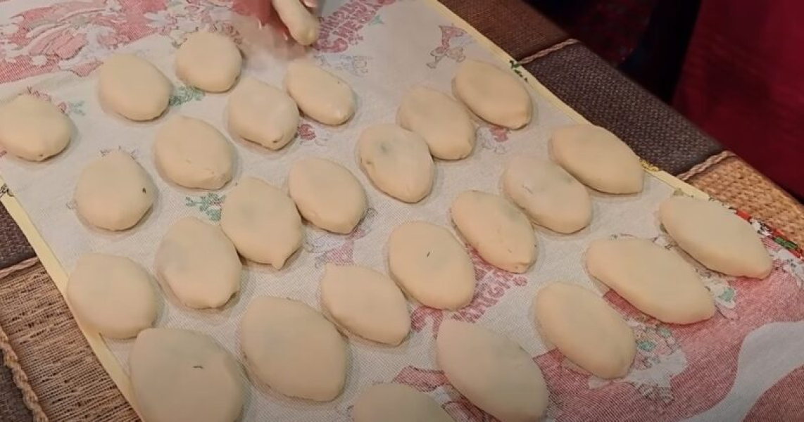 Вимішуємо тісто, додаючи залишки борошна за потребою. Тісто виходить трохи липким. Відразу нарізаємо на частини, руками формуємо коржики. На центр укладаємо на начинку та заліплюємо. Вироби викладаємо на рушник.