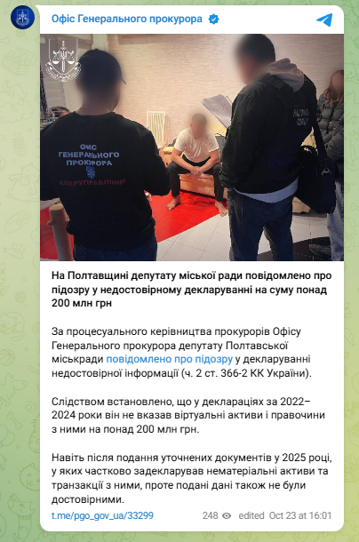 На Полтавщині депутату міської ради повідомлено про підозру у недостовірному декларуванні на суму понад 200 млн грн. За даними слідства, у деклараціях за 2022–2024 роки він не вказав віртуальні активи та операції з ними. Навіть уточнені документи, подані у 2025 році, містили недостовірну інформацію, що стало підставою для відкриття кримінального провадження, інформує Офіс Генерального прокурора.