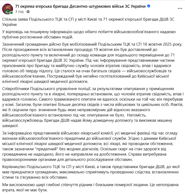 «Зазначений громадянин дійсно був мобілізований Подільським ТЦК та СП 18 жовтня 2025 року. Після проходження всіх встановлених процедур 19 жовтня він був доставлений до розподільчого пункту та включений до складу команди для подальшого переміщення до 71 окремої єгерської бригади ДШВ ЗС України. Під час інформування представниками частини призовників про бригаду та майбутню службу чоловік втратив свідомість, впав і вдарився головою об тверду підлогу. Це сталося на очах багатьох свідків – військовослужбовців та військовозобов’язаних. Постраждалий був негайно госпіталізований до Київської міської клінічної лікарні швидкої медичної допомоги», – йдеться у повідомленні.