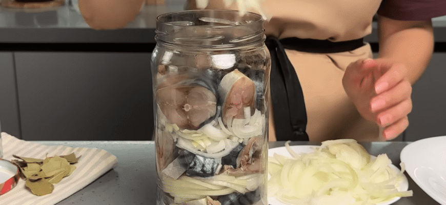 Цибулю нарізаємо півкільцями. Вона тут відіграє важливу роль, адже виходить не менш смачною, ніж сама риба. Далі беремо банку або іншу зручну ємність. На дно викладаємо шар цибулі, додаємо лавровий лист і кілька горошин духмяного перцю. Потім кладемо шар риби й знову цибулю. Так чергуємо шари, злегка ущільнюючи, поки не закінчаться всі інгредієнти. Останнім шаром обов’язково має бути цибуля.