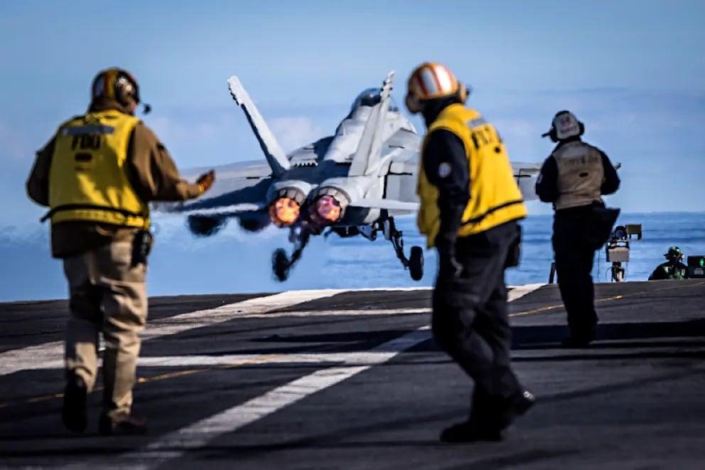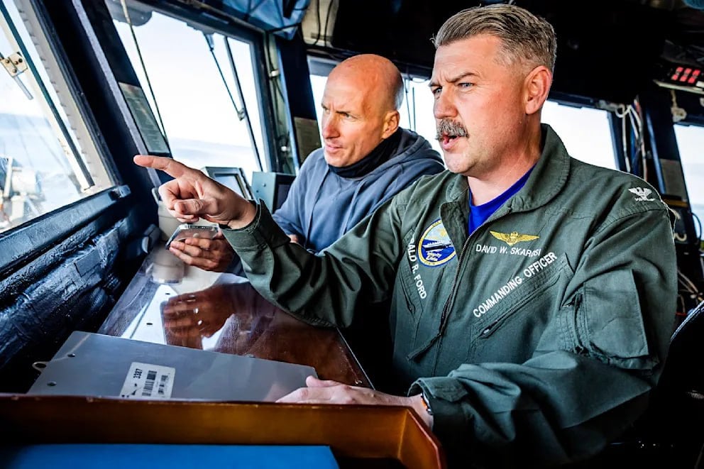 На палубі авіаносця стоять винищувачі F/A-18 Super Hornet. За ними – місток, де знаходиться капітан корабля Девід Скарозі. Він не вимовляє жодного слова про Росію, але всім ясно, хто в регіоні розглядається як потенційний противник, йдеться у матеріалі.