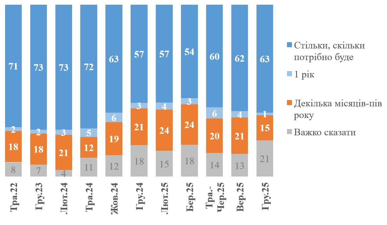 Результати показують, що 63% українців готові терпіти війну стільки, скільки потрібно, лише 1% – один рік, а 15% – кілька місяців чи півроку.