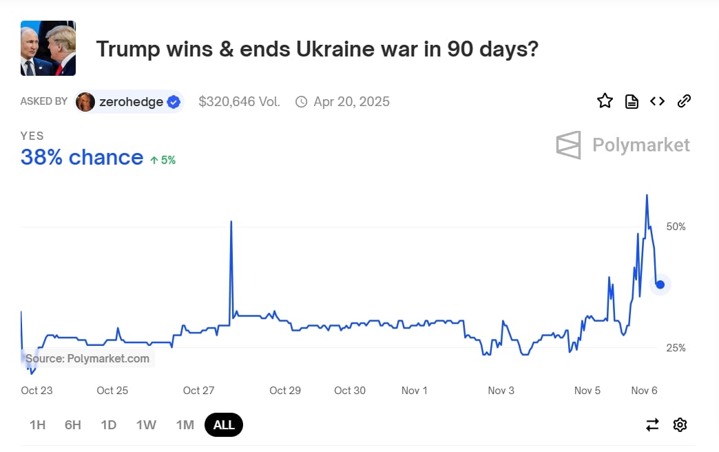 6 листопада, коли визначилася перемога Трампа, користувачі почали активно цікавитись цією ставкою. Шанси президента на успіх на піку були оцінені у 56%. Нині цей показник упав до 38%.