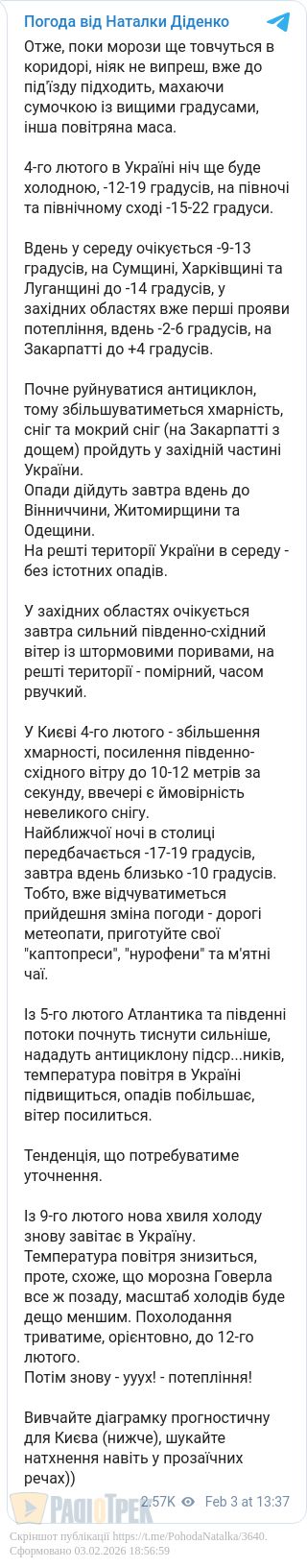 Температура повітря знизиться, проте, схоже, що морозна Говерла все ж позаду, масштаб холодів буде дещо меншим. Похолодання триватиме, орієнтовно, до 12-го лютого, – пояснила синоптик.