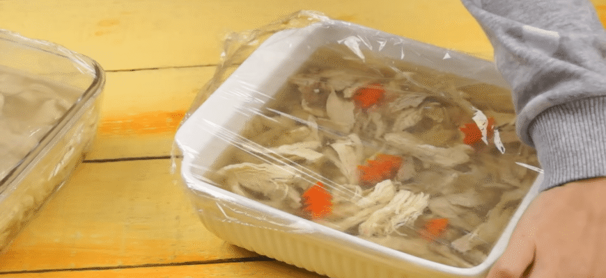 Далі бульйон проціджують і охолоджують до кімнатної температури. Важливо, щоб він не був занадто гарячим, коли заливають м’ясо або рибу, інакше страва втратить прозорість. Потім заливне ставлять у холодильник на кілька годин, щоб воно застигло. Результат, ніжне, прозоре і ароматне заливне, яке вражає не тільки смаком, а й зовнішнім виглядом.