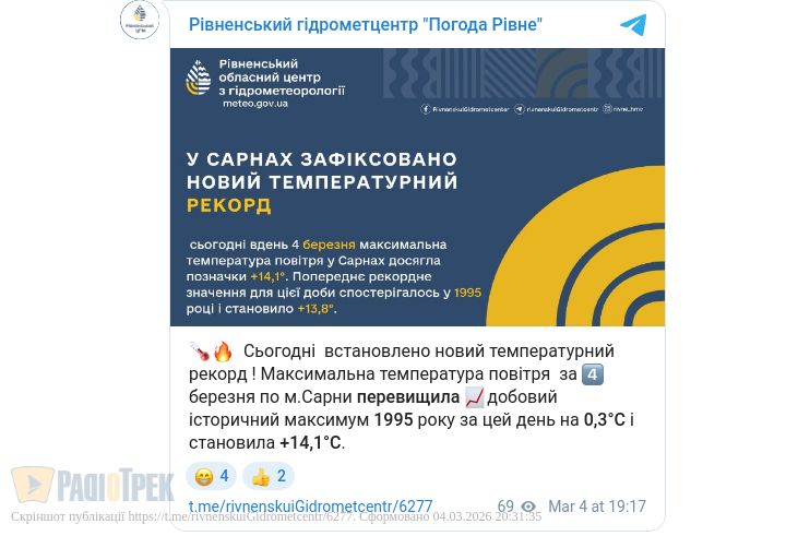 Сьогодні, 4 березня, на Рівненщині зафіксували новий температурний рекорд.