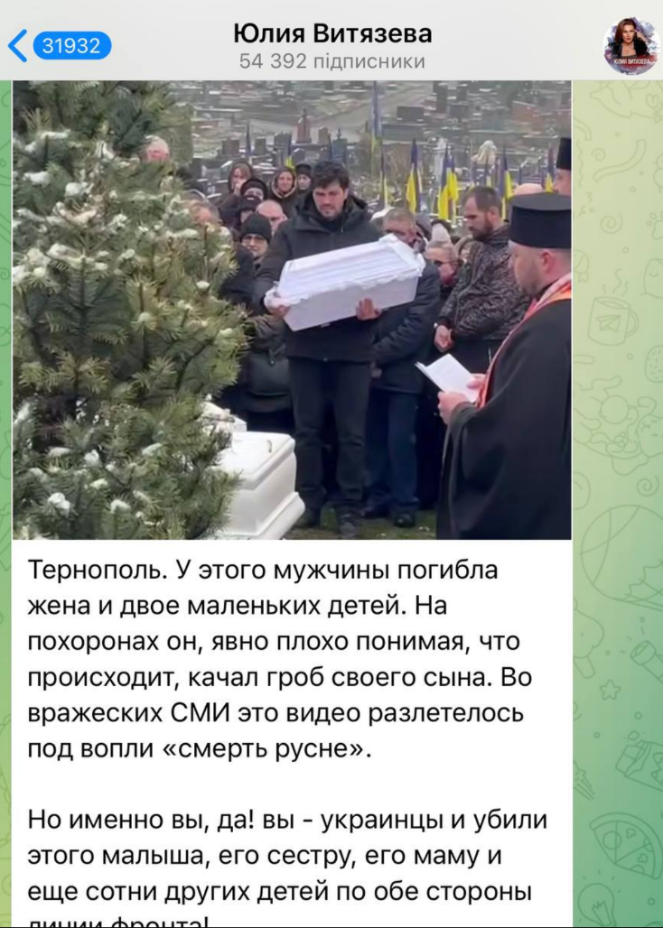 Журналіст Денис Казанський розповів, що російська пропагандистка Юлія Вітязева знущалася над відео похорону з Тернополя. Вона почала кричати, що українці самі винні, бо змусили Росію вбивати ракетами своїх сплячих дітей.