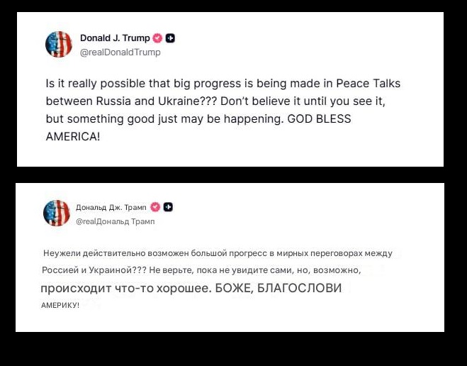 Президент США Дональд Трамп написав у соцмережах, що в переговорах щодо миру між Росією та Україною, “можливо, відбувається щось хороше”. Він наголосив, що прогрес може бути реальним, але закликав “не вірити, доки не побачите”.
