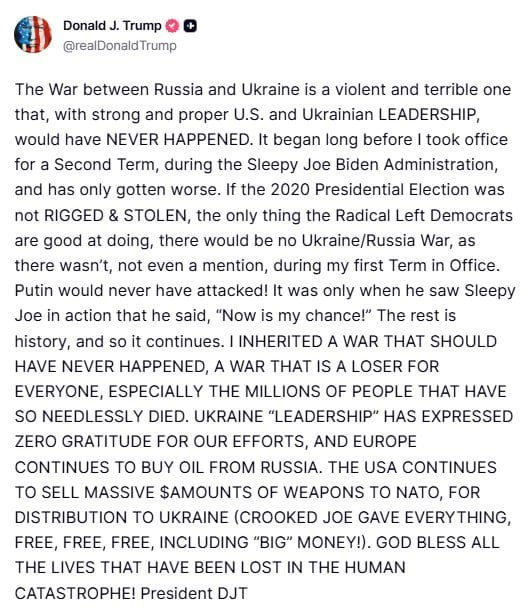 «Війна між Росією та Україною — це жорстока та жахлива війна, яка за сильного і правильного керівництва США та України ніколи не почалася б. Вона почалася задовго до того, як я обійняв посаду на другий термін, під час адміністрації „Сонного Джо“ Байдена, і з того часу тільки погіршилася. Якби президентські вибори 2020 року не були сфальсифіковані та вкрадені — єдине, в чому радикальні ліві демократи гарні — війни між Україною та Росією не було б, як її не було навіть згадок під час мого першого терміну», — написав Трамп.
