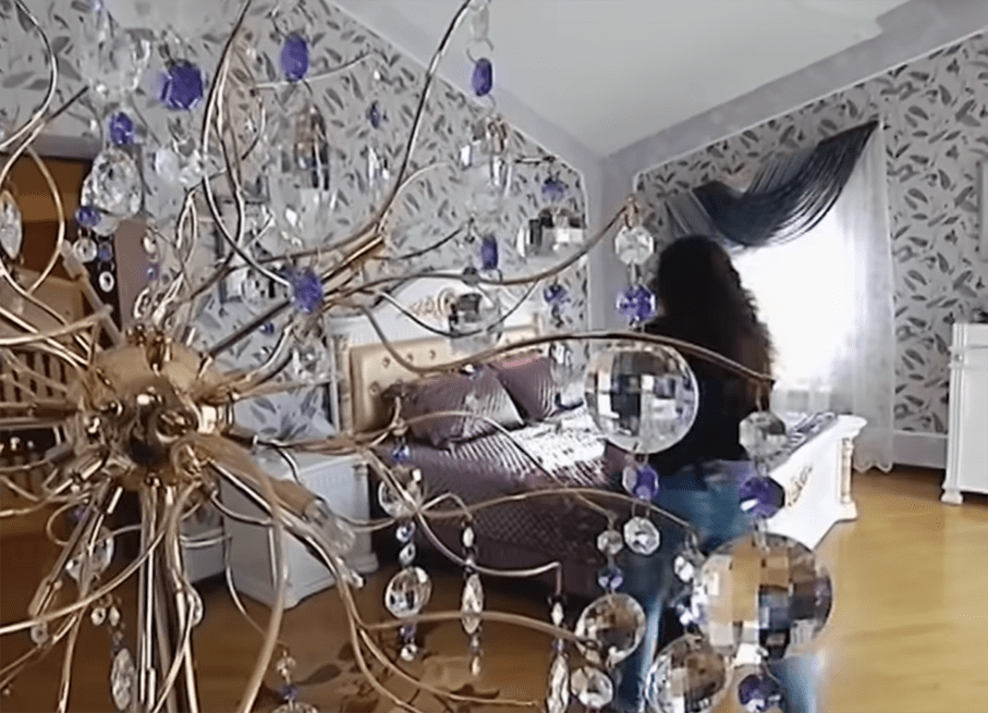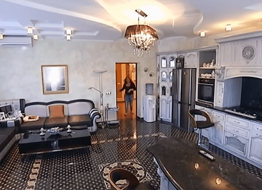 Величезний хол, круглі сходи, люстра, що сяє на стелі. Розкіш виринає з кожного куточка цієї оселі. Кухня та спальня вражають розмірами та купою меблів. Як годиться, є джакузі та басейн. І, звісно ж, гардеробна.