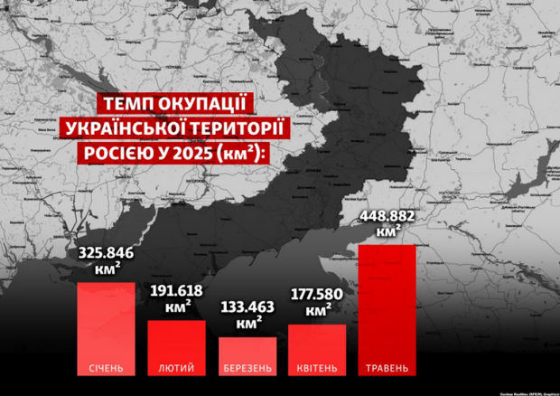 За підрахунками OSINT-проєкту DeepState, від початку року загальна площа територій, які тимчасово перейшли під контроль росіян, сягнула майже 1300 квадратних кілометрів. Для порівняння: у квітні загарбникам вдалося просунутися на 175 км², тоді як у травні цей показник зріс у понад 2,5 раза.