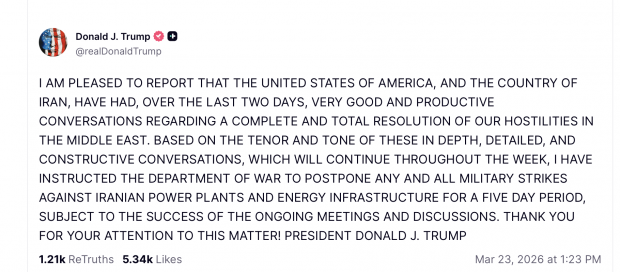Трамп заявив, що за останні два дні США та Іран провели “дуже вдалі та продуктивні” переговори щодо врегулювання ситуації на Близькому Сході. “Виходячи з духу й тону цих глибоких і конструктивних переговорів, які триватимуть упродовж усього тижня, я дав розпорядження міністерству оборони відкласти будь-які військові удари по іранських електростанціях та енергетичній інфраструктурі на п’ятиденний строк за умови успіху поточних зустрічей та дискусій”, – написав Трамп.