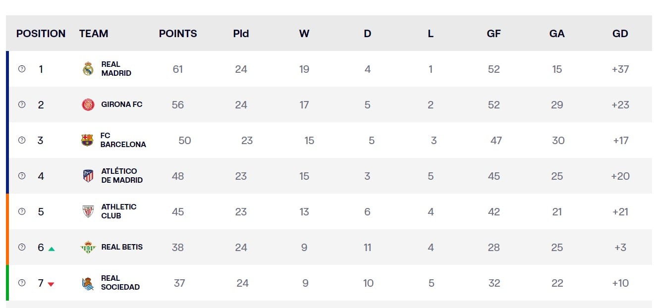 Після 24-х зіграних поєдинків у “Реала” 61 очко та лідируюча сходинка. “Жирона” йде другою з 56 балами та ризикує підпустити до себе на відстань однієї перемоги “Барселону”, якщо каталонці виграють свій матч цього туру.