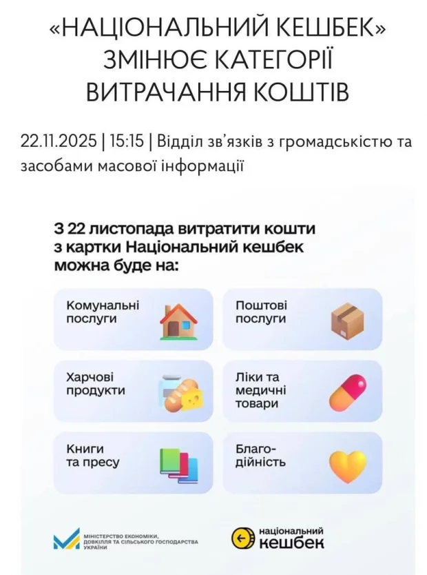 В 2025 році кошти можна використати лише на оплату комунальних платежів, поштових послуг, продуктів харчування, ліків та медичних виробів, книжок й друкованої продукції, а також на благодійність — зокрема на підтримку ЗСУ. Саме ці категорії залишилися доступними для витрат як у кешбеці, так і у Зимовій підтримці.