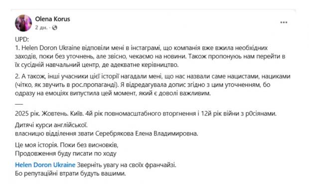 Згодом на своїй сторінці у соцмережі Facebook вона повідомила, що Helen Doron Ukraine відреагували на інцидент. “Helen Doron Ukraine відповіли мені в Instagram, що компанія вже вжила необхідних заходів, поки без уточнень, але, звісно, чекаємо на новини. Також пропонують нам перейти в їхній сусідній навчальний центр, де адекватне керівництво”, – резюмувала Олена.