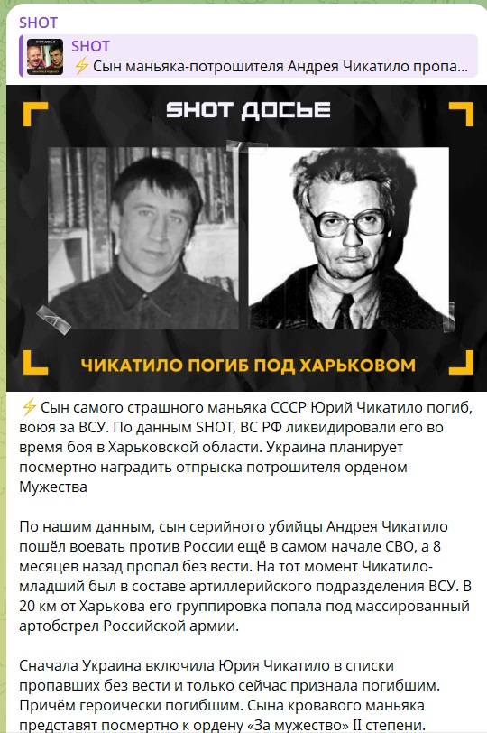 Зазначимо, що 20 серпня російський Telegram-канал Shot опублікував допис про нібито загибель сина Чикатила на фронті. У повідомленні йшлось, що чоловік воював в українській армії від початку повномасштабного вторгнення й загинув під час «масованого артобстрілу російської армії» за 20 кілометрів від Харкова.