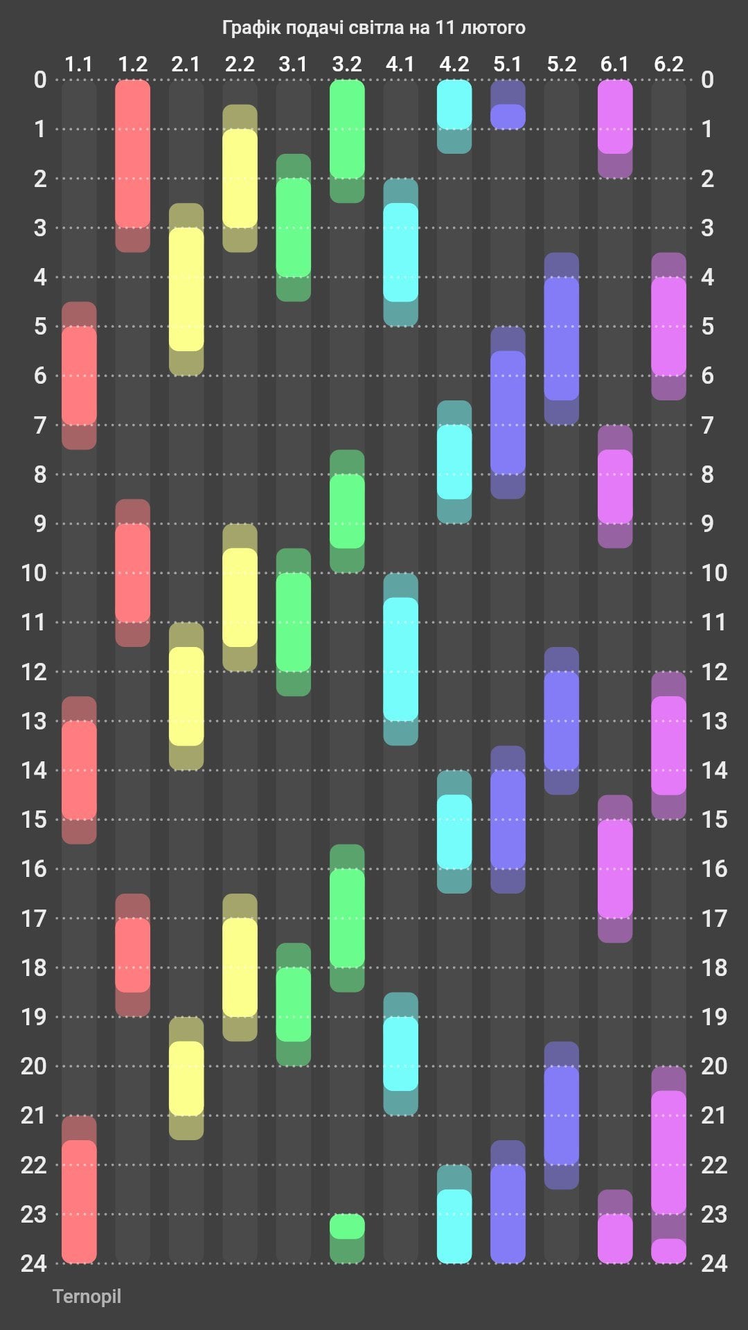 Чepгa 2.1: 0:00-4:00, 6:00-10:00, 12:00-16:00, 18:00-22:00