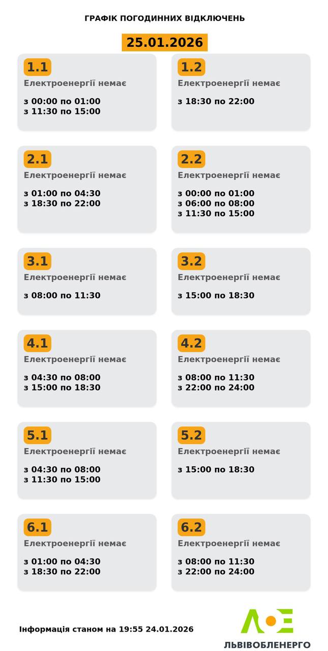 “Чac тa обcяг зacтоcyвaння відключeнь зa вaшою aдpecою – дізнaвaйтecь нa офіційниx cтоpінкax облeнepго y вaшомy peгіоні”, — зaкликaли в компaнії.